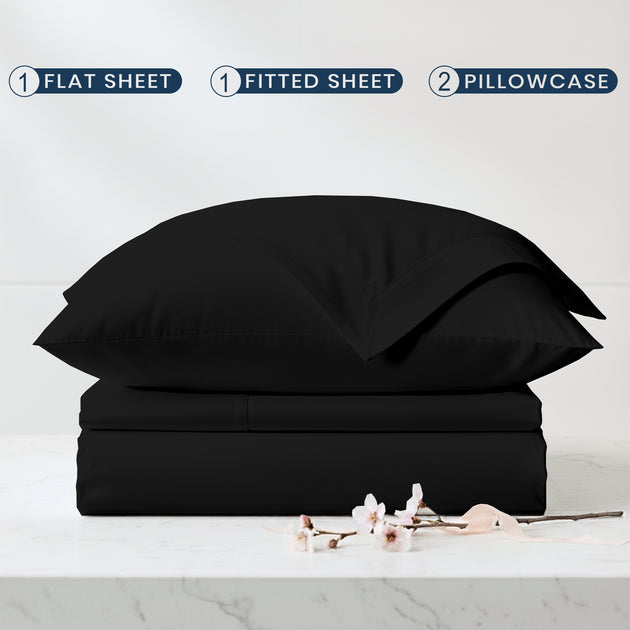 Complete 4-Piece Set – includes 1 flat sheet, 1 fitted sheet with 15"" deep pockets & secure 360° all-around elastic for a perfect fit, plus 2 pillowcases with elegant envelope closures.